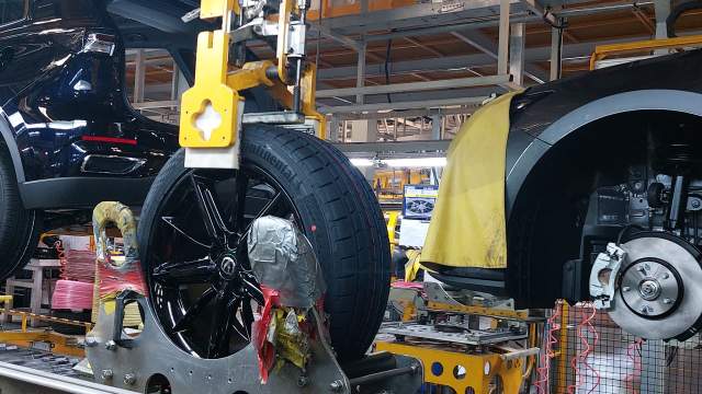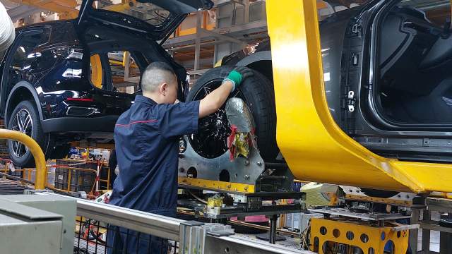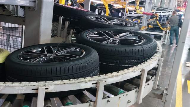 В России и Changan в настоящее время предлагает 15 моделей, от скромного седана Alsvin, аналога «Соляриса» и «Рио», до современной линейки UNI, куда входят два кроссовера и один спортивный лифтбек. Нам показали производство двух моделей — Changan CS55 Plus и UNI-V. Процесс максимально автоматизирован — цех сварки на 94%, сборки — на 80%. Людей немного, они в основном занимаются мелкими операциями. Вот специальный робот достает скатывающиеся по серпантину колеса и приставляет к ступицам автомобиля — работнику лишь остается закрутить гайки. В цехах чисто, а едущие по конвейеру кузова собраны аккуратно и ровно окрашены.
