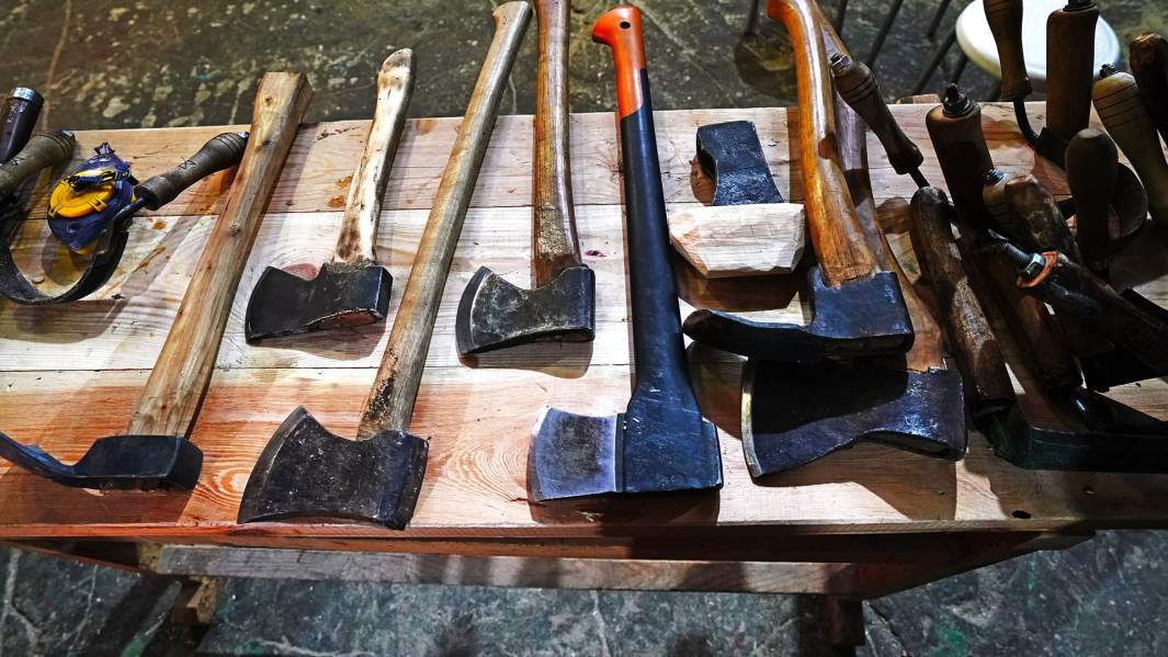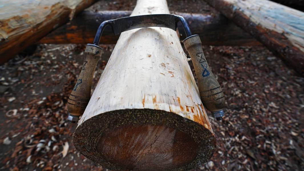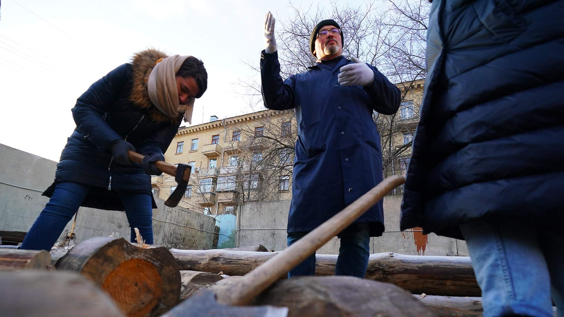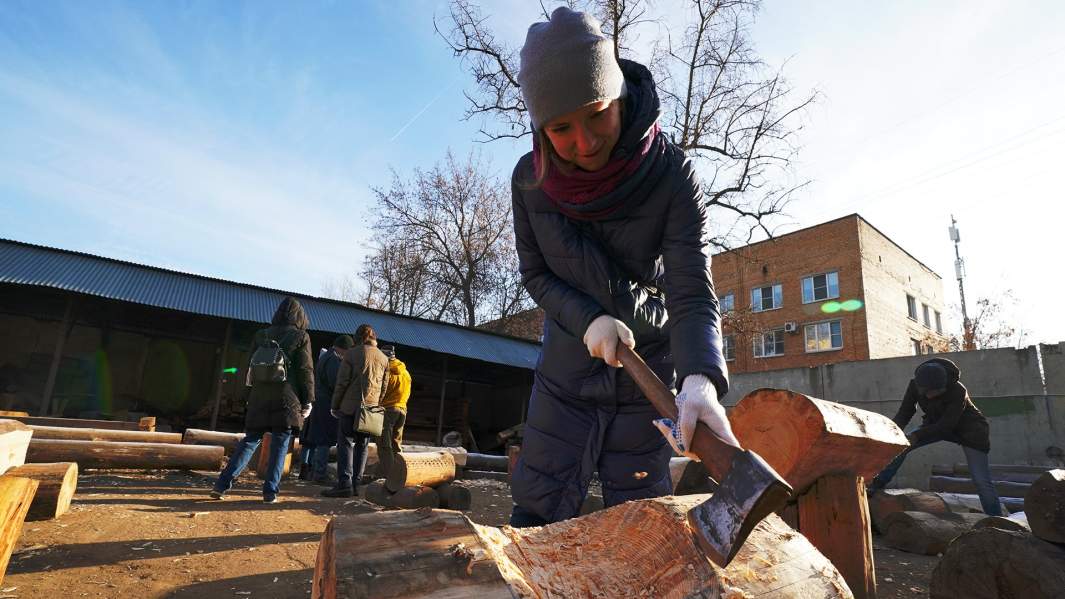 «Дерево», в отличие от двух других классов, проходит на специально огороженной территории на улице. В ноябрьском воздухе, в окружении пятиэтажек, звенит стук топоров, терпко пахнет свежим срубом.